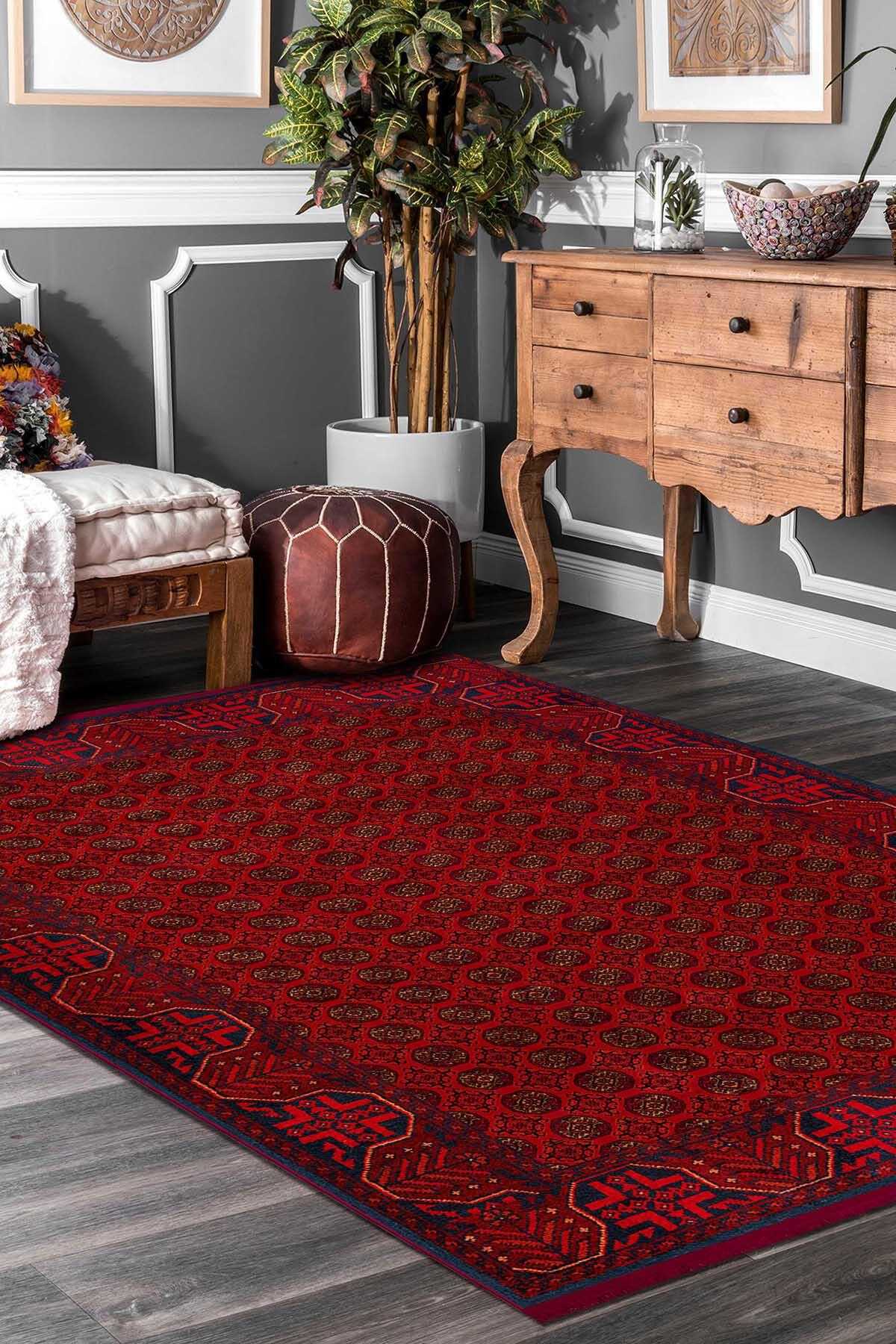 Bordo Afgan Desenli Pamuk Taban Dijital Baskılı Halı