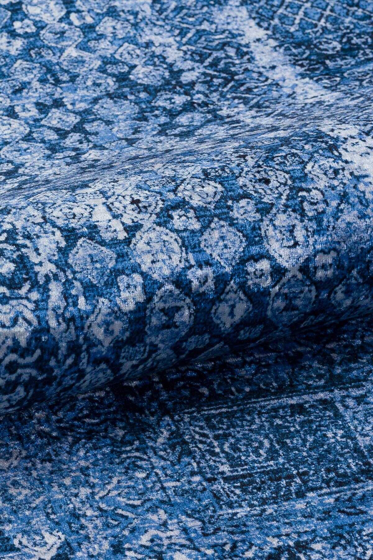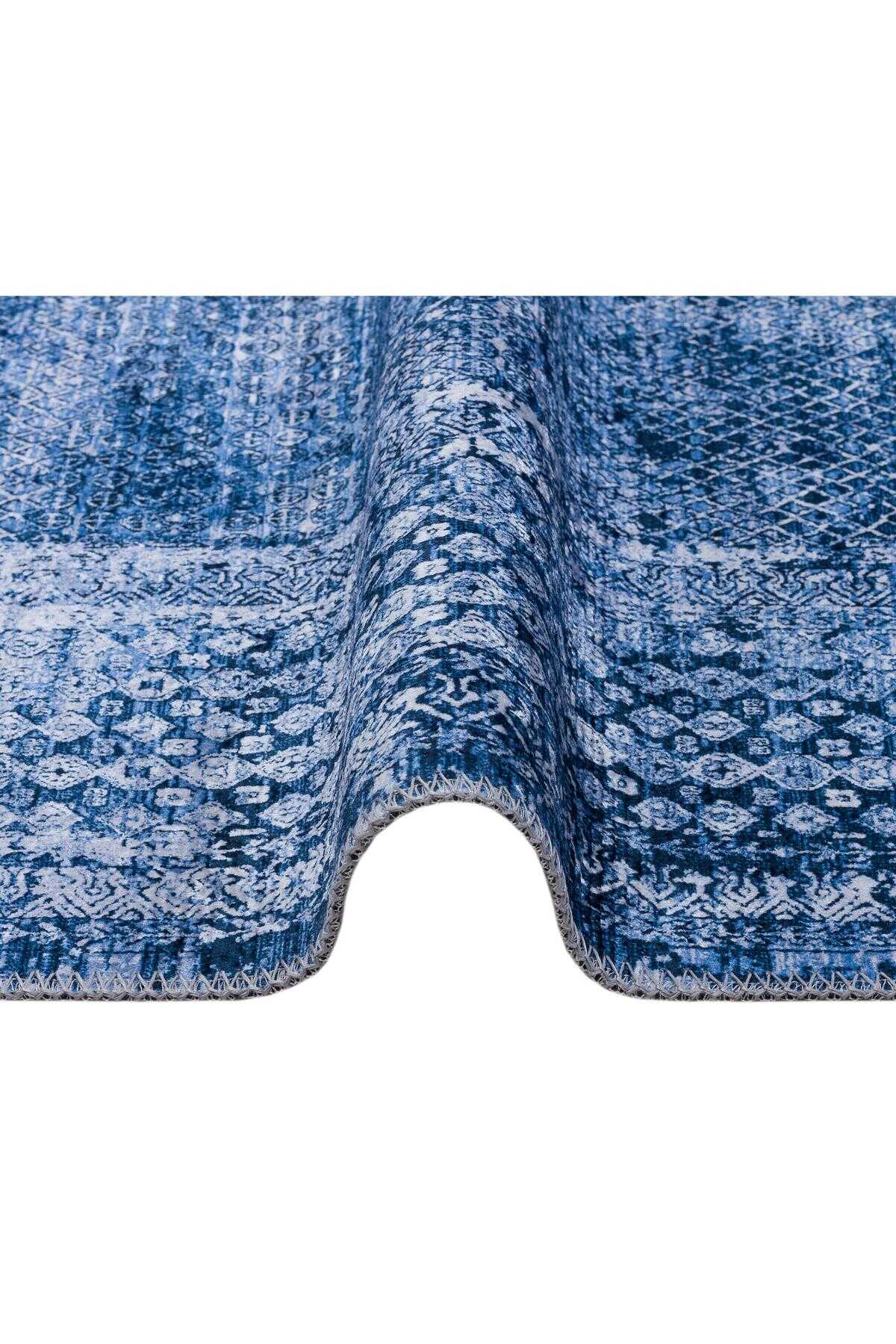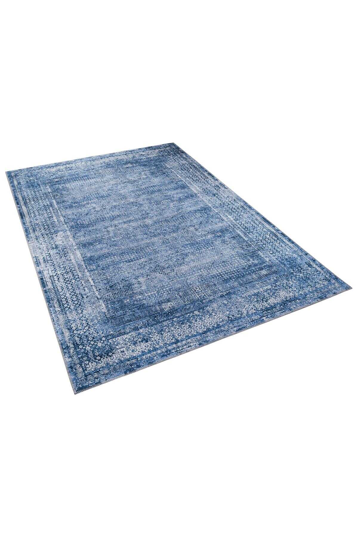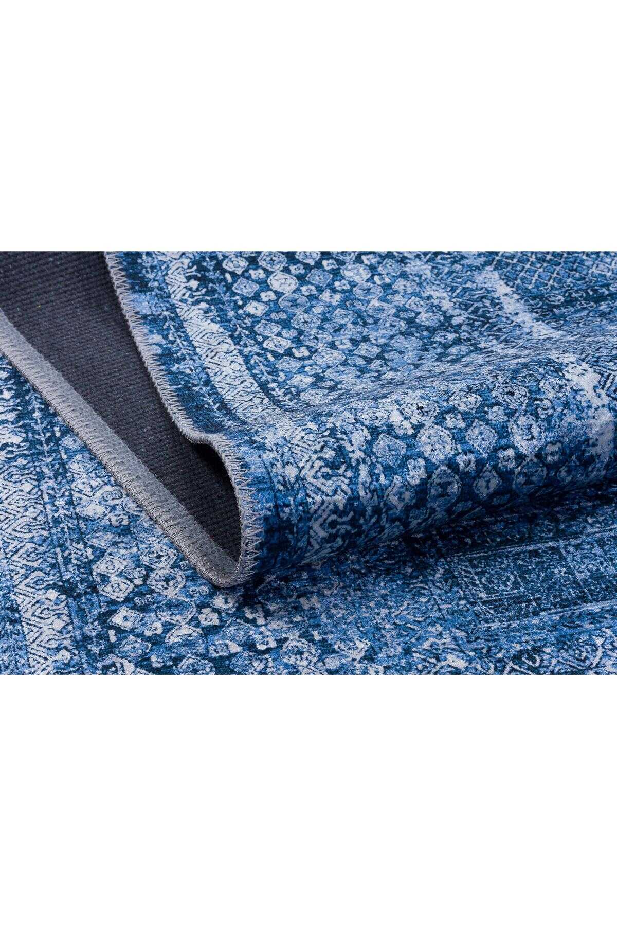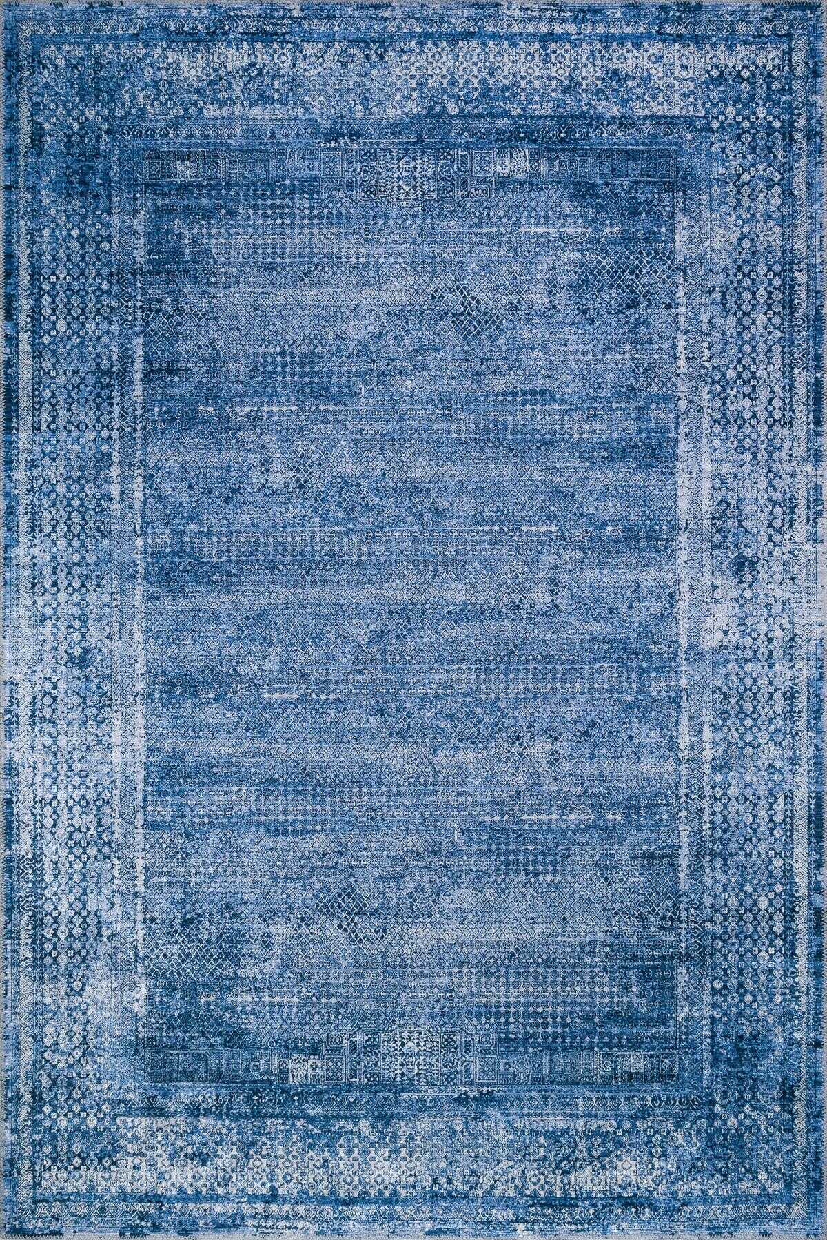 Çerçeve Desenli Pamuk Taban Dijital Baskılı Dekoratif Halı Mavi