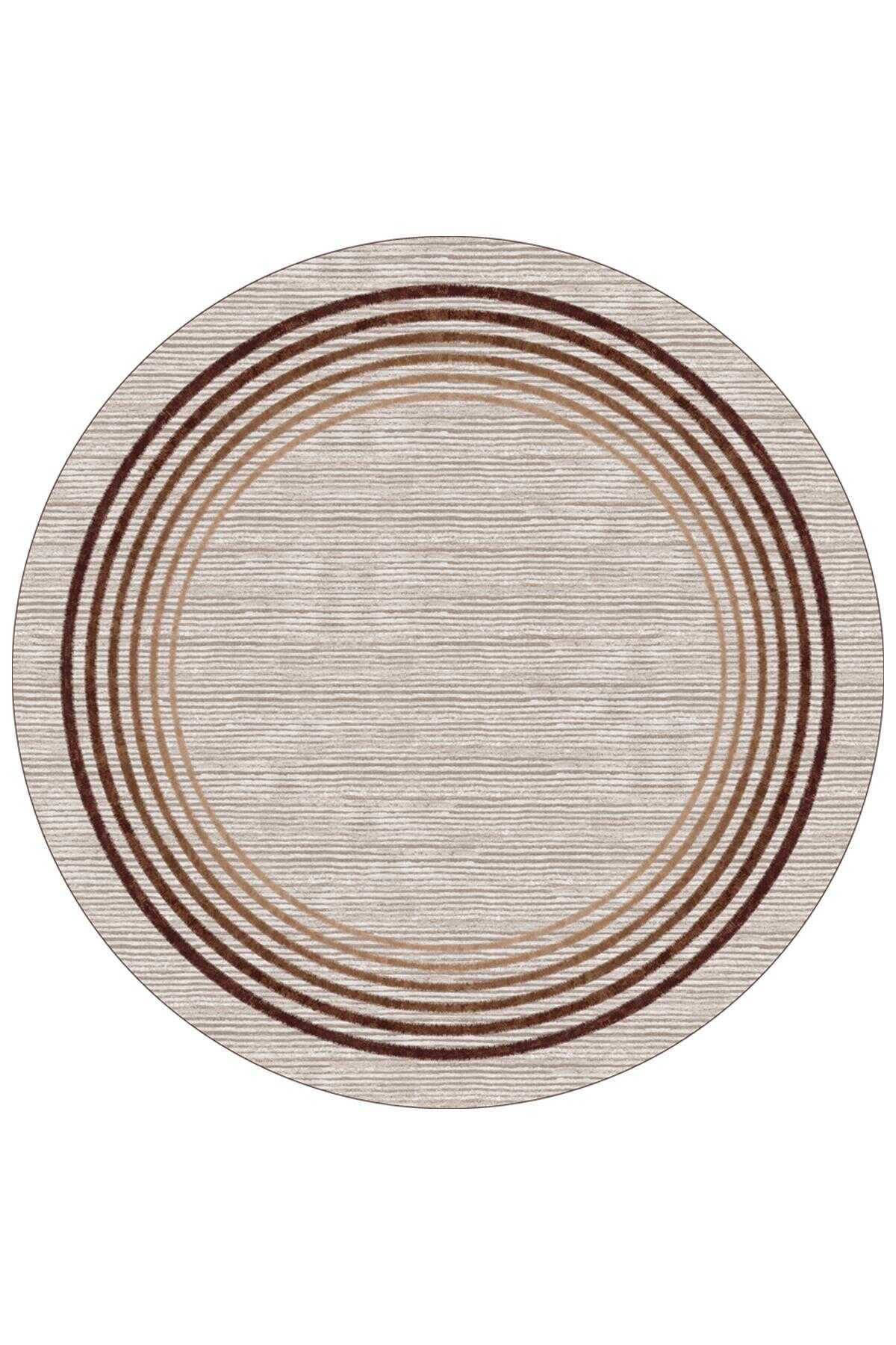 Çerçeve Desenli Pamuk Taban Dijital Baskılı Yuvarlak Halı Kahve