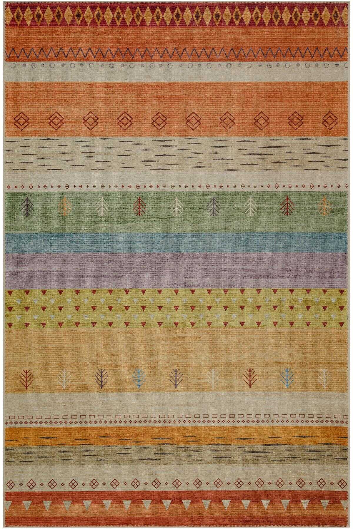 Etnik Kilim Desenli Pamuk Taban Yıkanabilir Baskılı Halı Turuncu