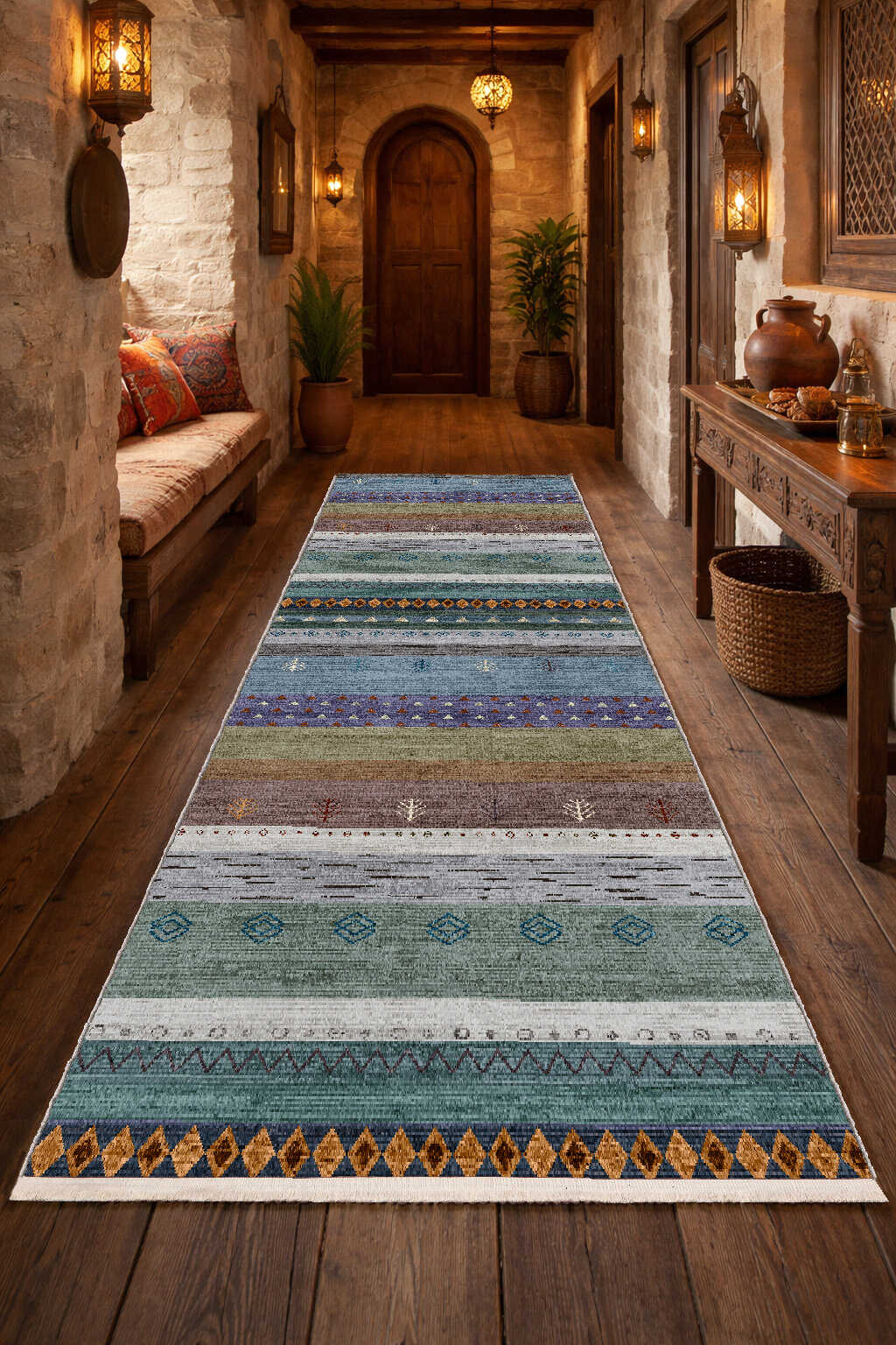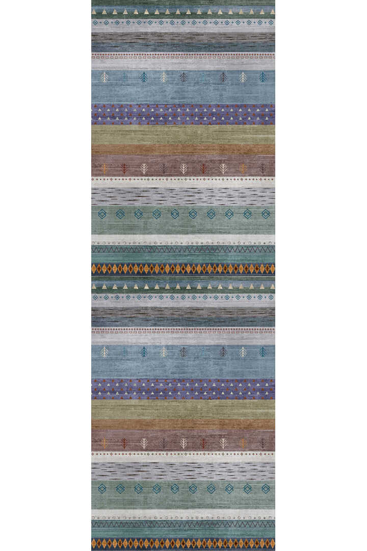 Etnik Kilim Desenli Pamuk Taban Yıkanabilir Baskılı Yolluk Kesme Halı Mavi