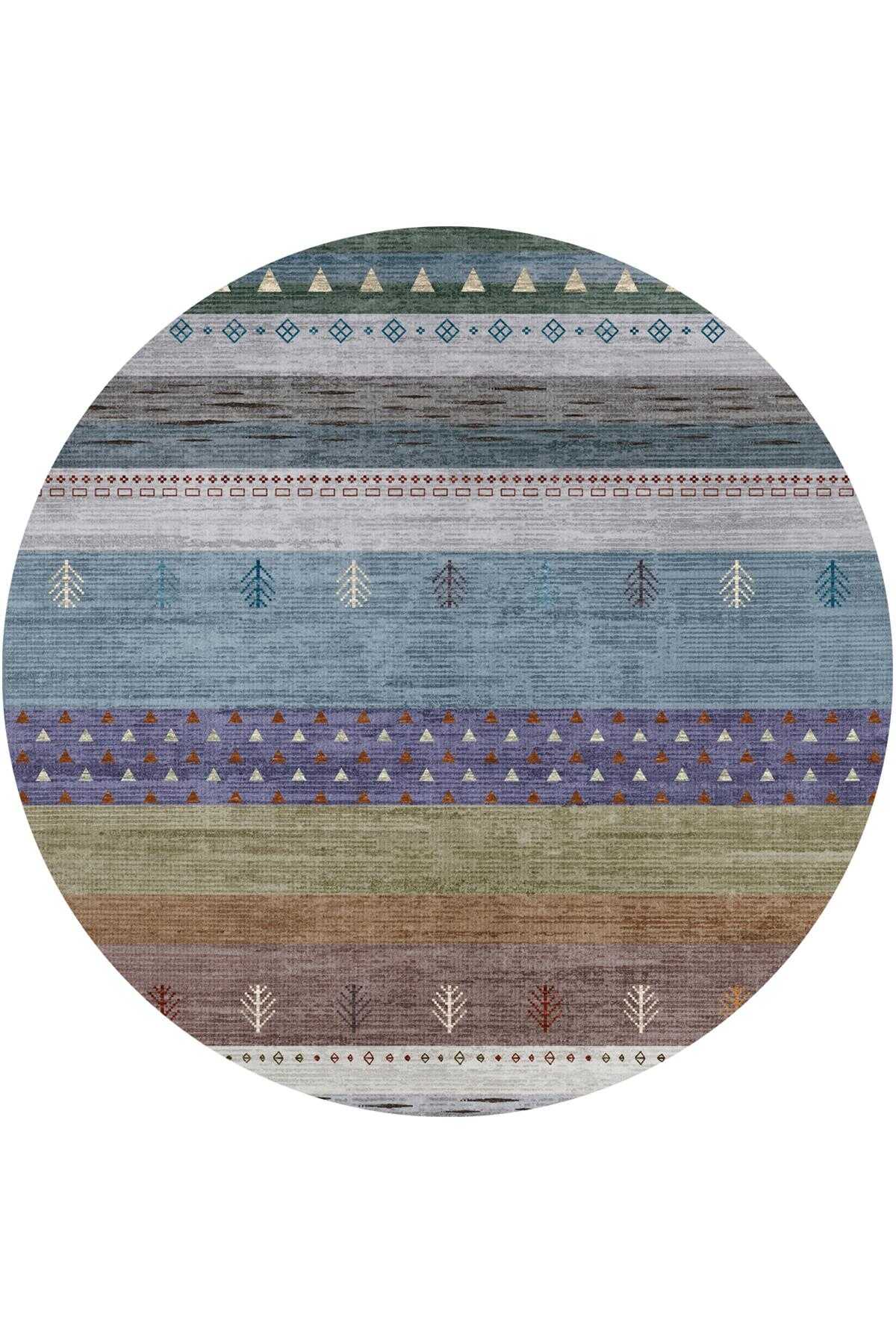 Etnik Kilim Desenli Pamuk Taban Yıkanabilir Baskılı Yuvarlak Halı Mavi