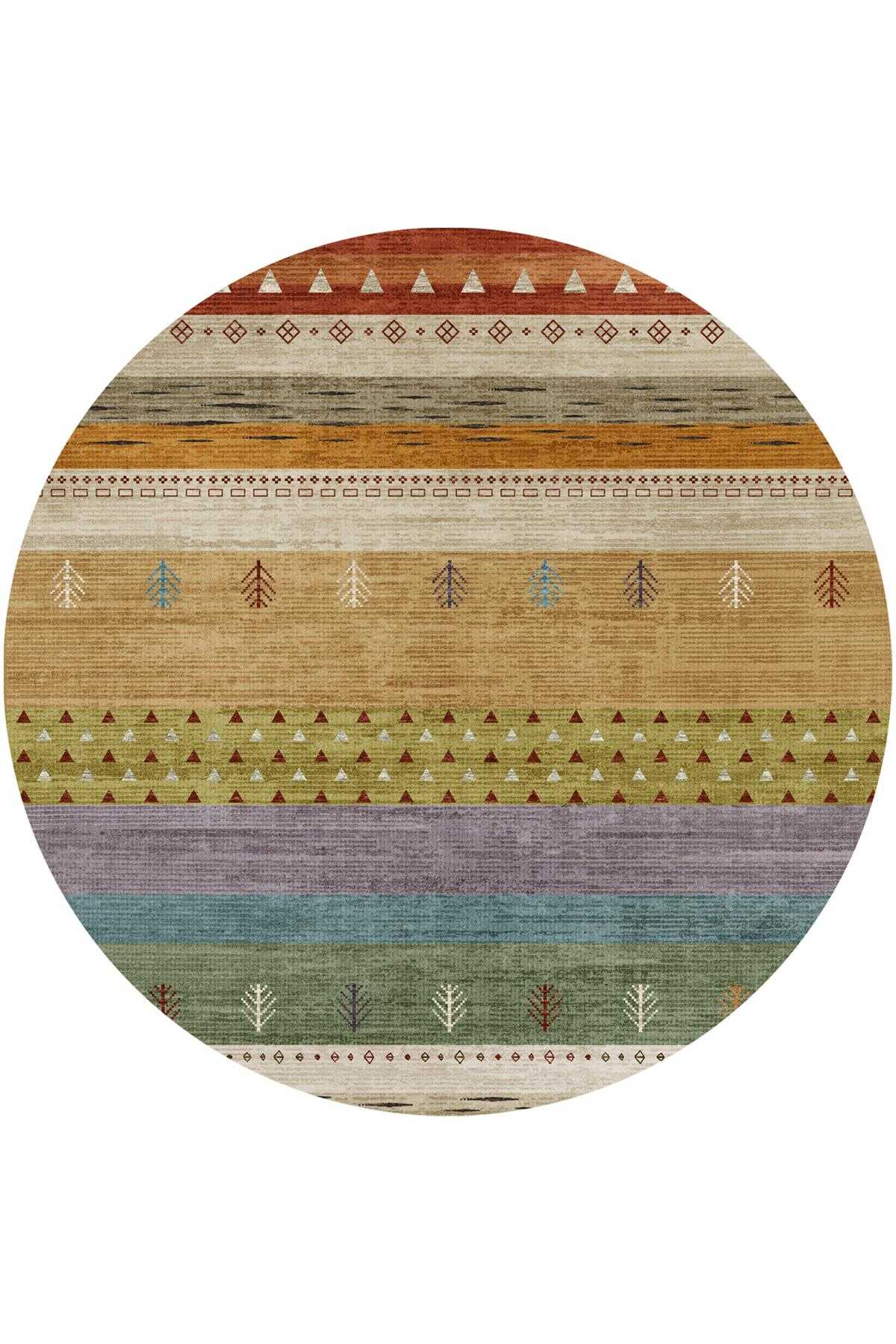 Etnik Kilim Desenli Pamuk Taban Yıkanabilir Baskılı Yuvarlak Halı Turuncu