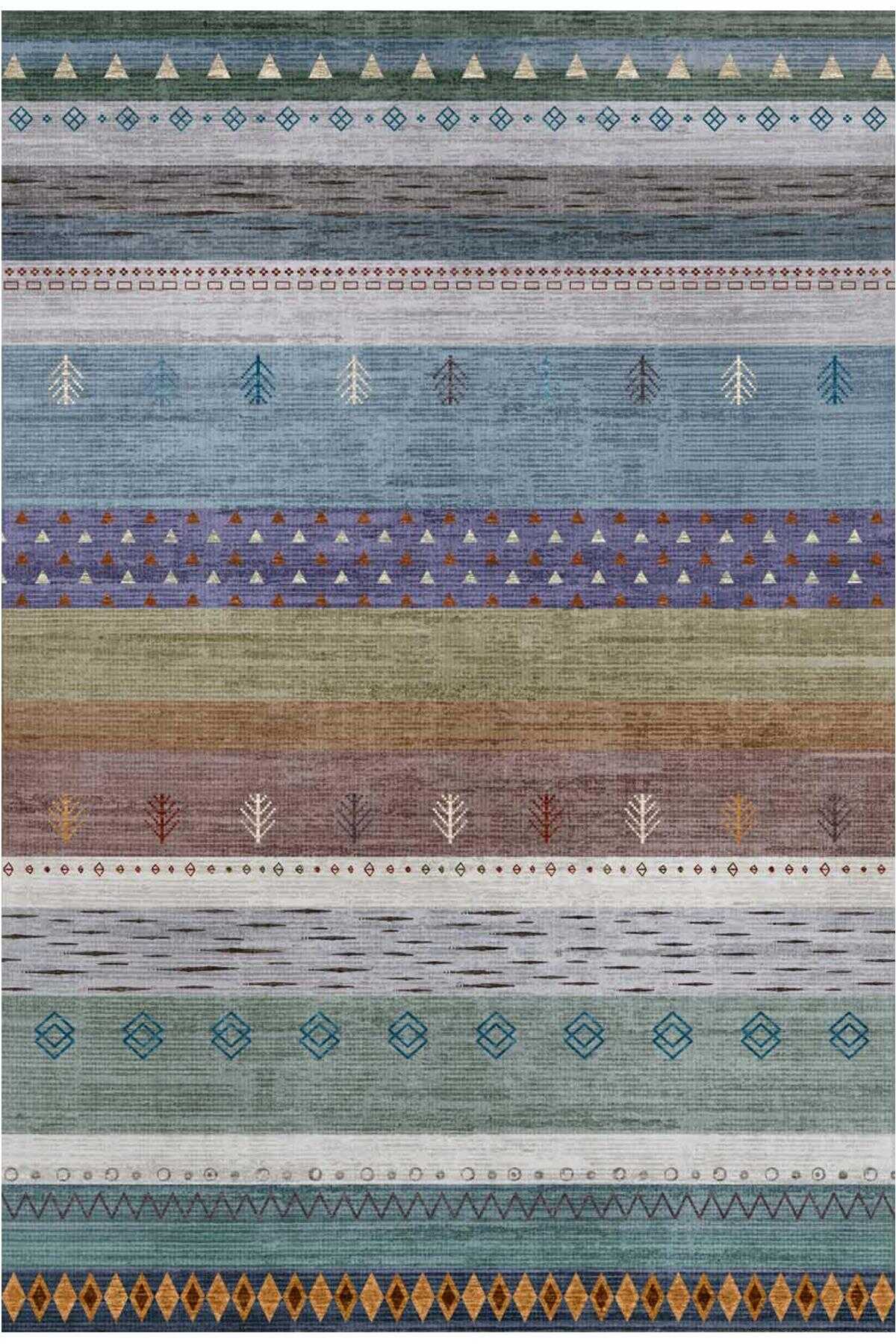 Etnik Kilim Desenli Şönil Taban Yıkanabilir Baskılı Halı Mavi