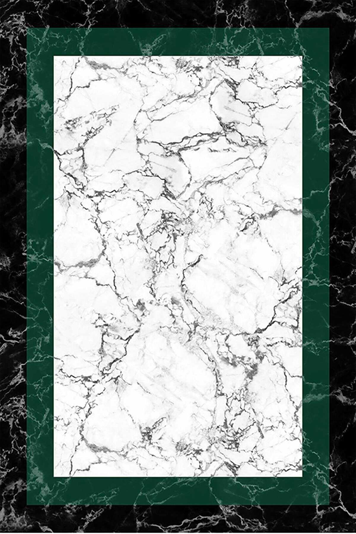 Frenda Home Çerçeve Mermer Desen Kaymaz Deri Taban Dekoratif Halı Yeşil