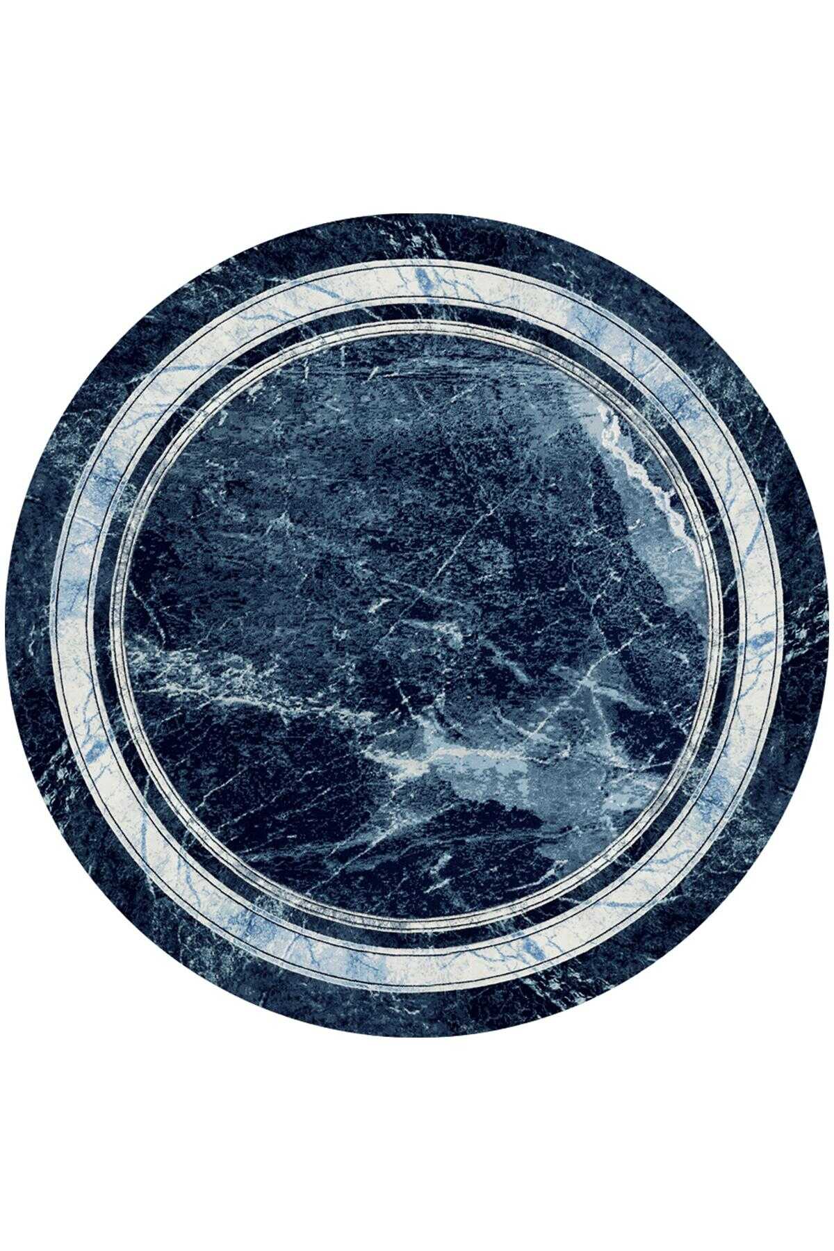 Frenda Home Çerçeve Mermer Desen Pamuk Taban Yıkanabilir Baskılı Yuvarlak Halı Lacivert