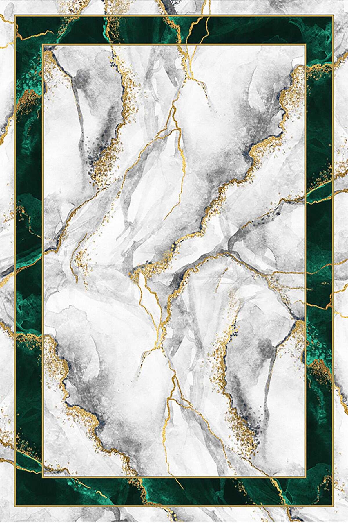 Frenda Home Çerçeveli Mermer Desen Kaymaz Deri Taban Dekoratif Halı Yeşil