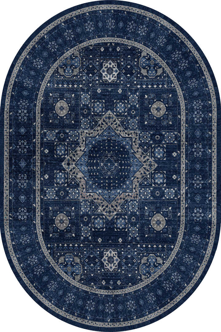 Frenda Home Fas Kapısı Desenli Yıkanabilir Pamuk Taban Oval Halı Lacivert