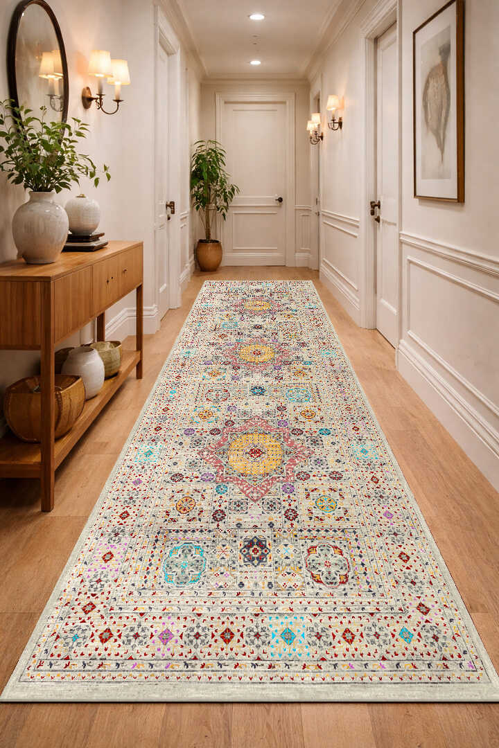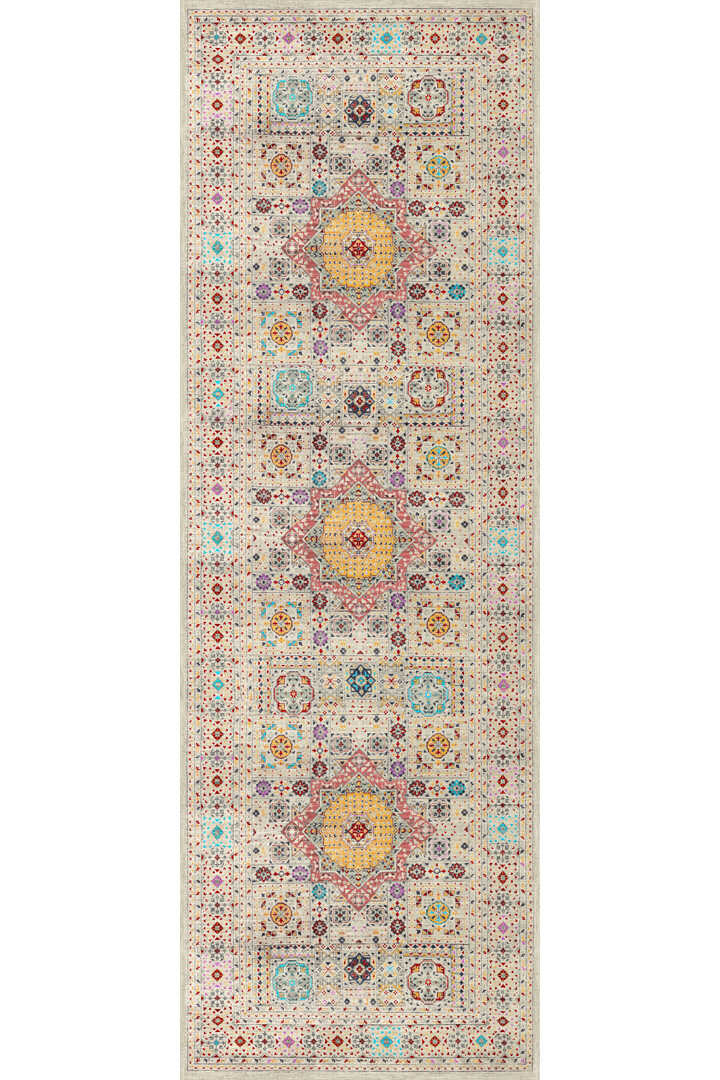 Frenda Home Fas Kapısı Desenli Yıkanabilir Pamuk Taban Özel Kesme Yolluk Halı Krem