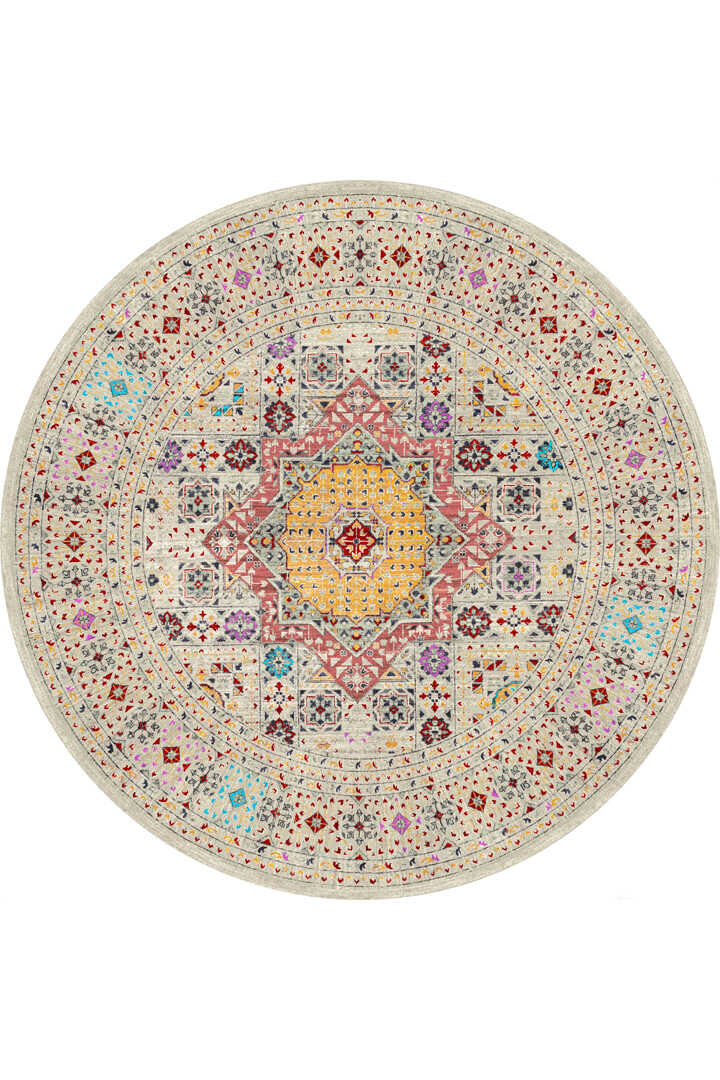 Frenda Home Fas Kapısı Desenli Yıkanabilir Pamuk Taban Yuvarlak Halı Krem