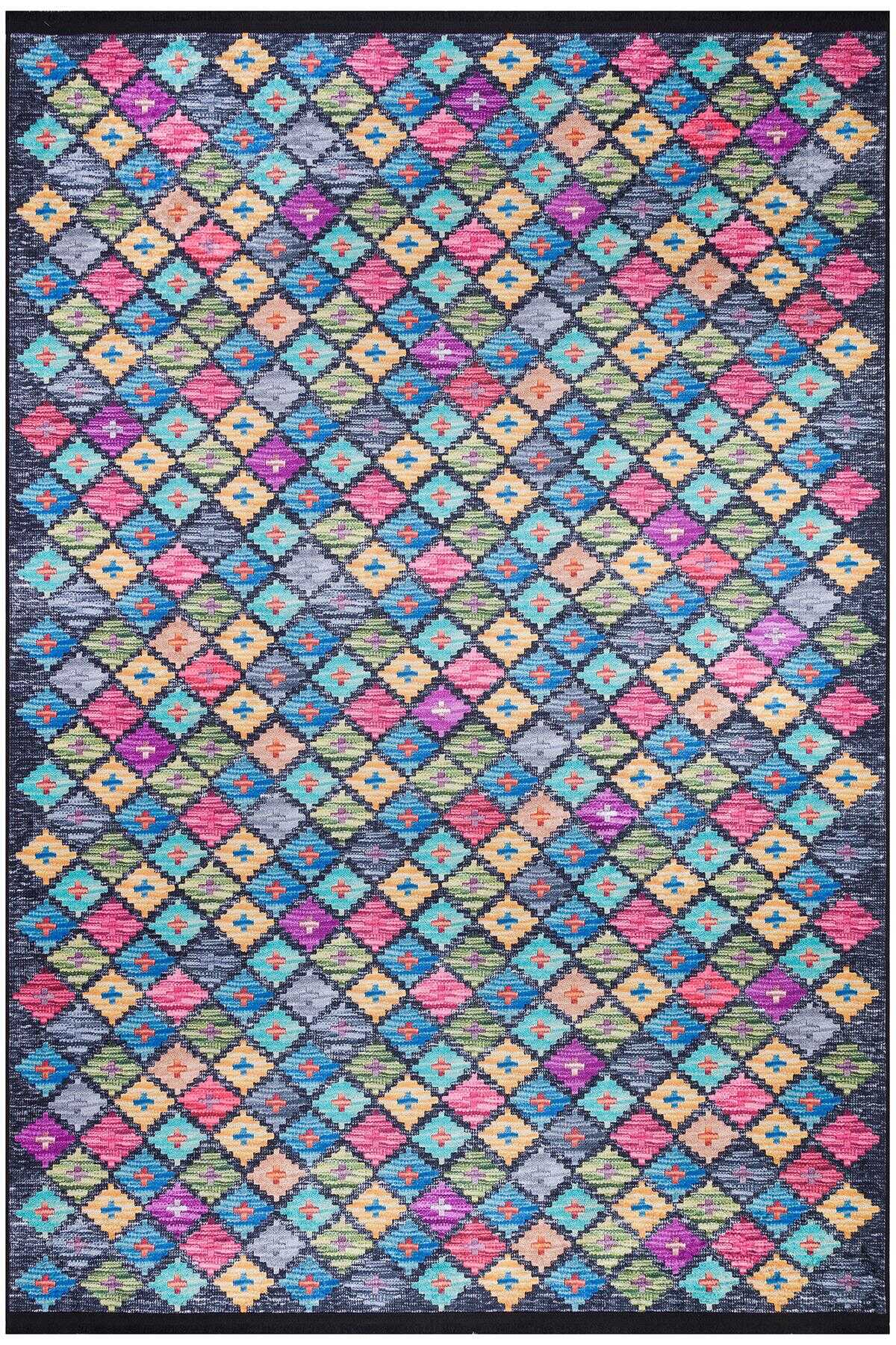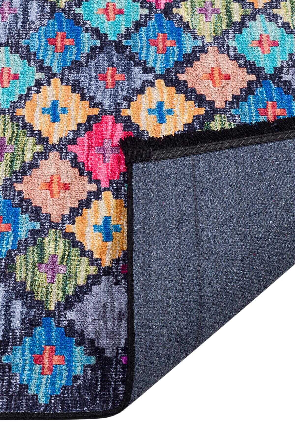 Frenda Home Kilim Desen Pamuk Taban Baskılı Halı Siyah