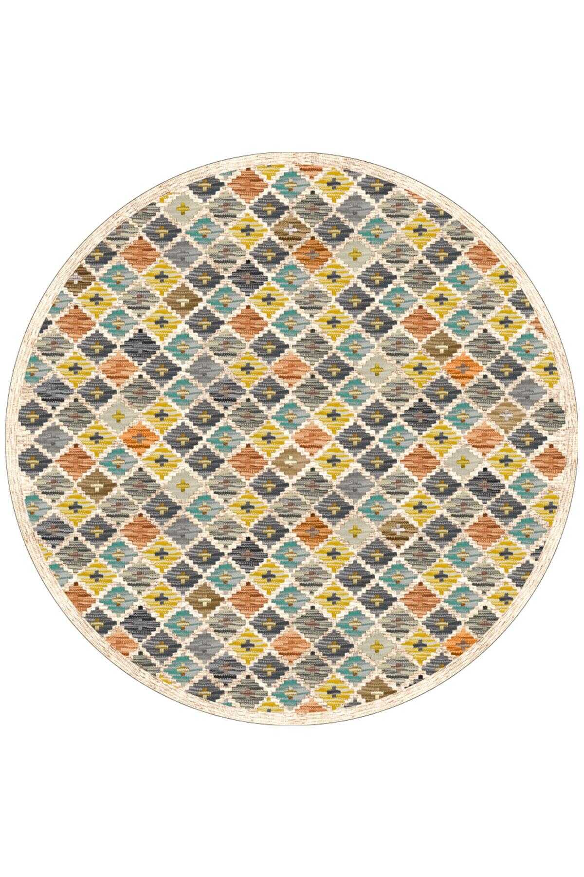 Frenda Home Kilim Desen Pamuk Taban Baskılı Yuvarlak Halı Krem