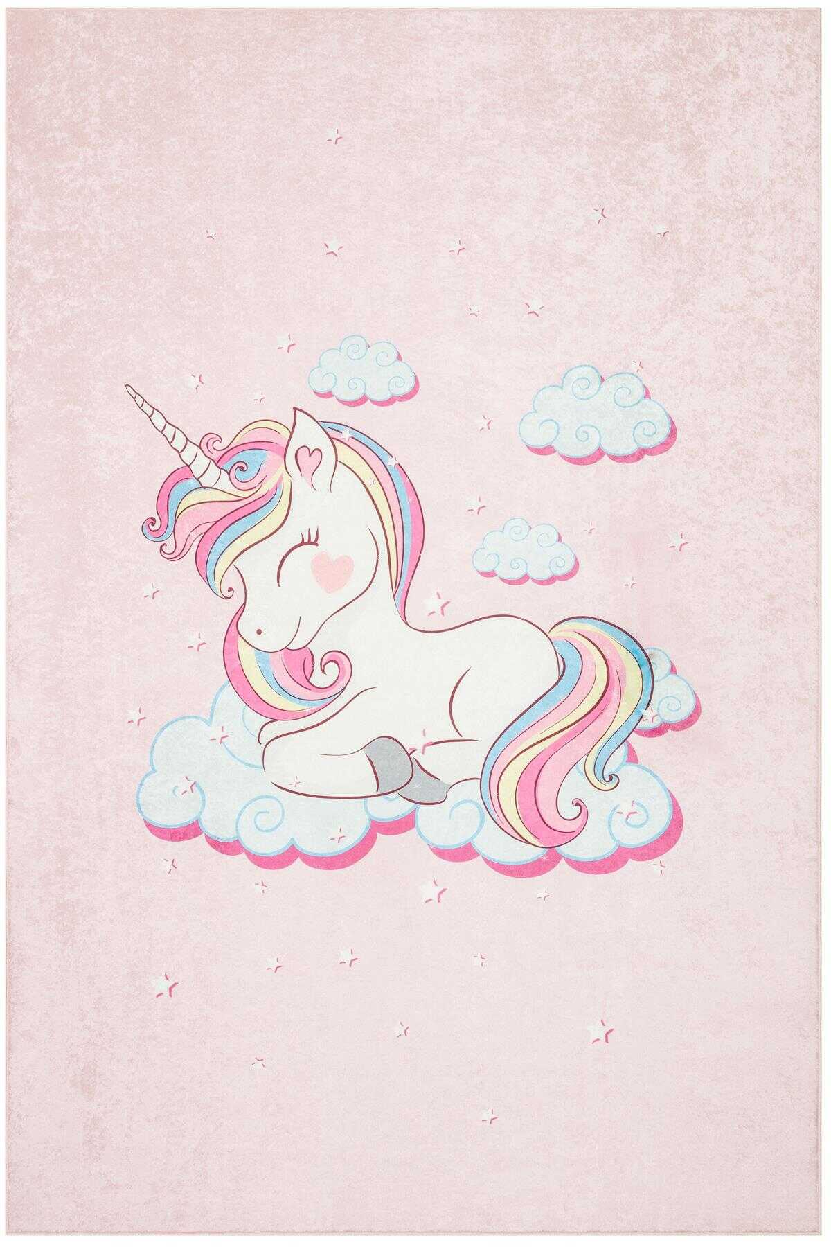 Frenda Home Unıcorn Pamuk Taban Dekoratif Baskılı Çocuk Odası Halısı Pembe