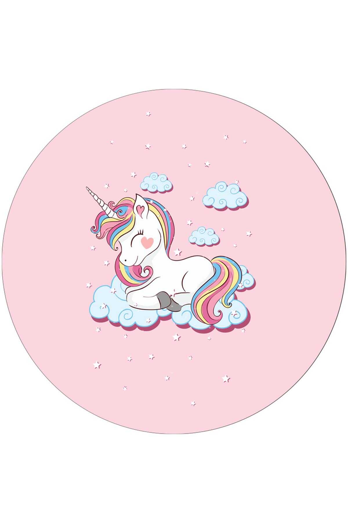 Frenda Home Unıcorn Pamuk Taban Dekoratif Baskılı Yuvarlak Çocuk Odası Halısı Pembe