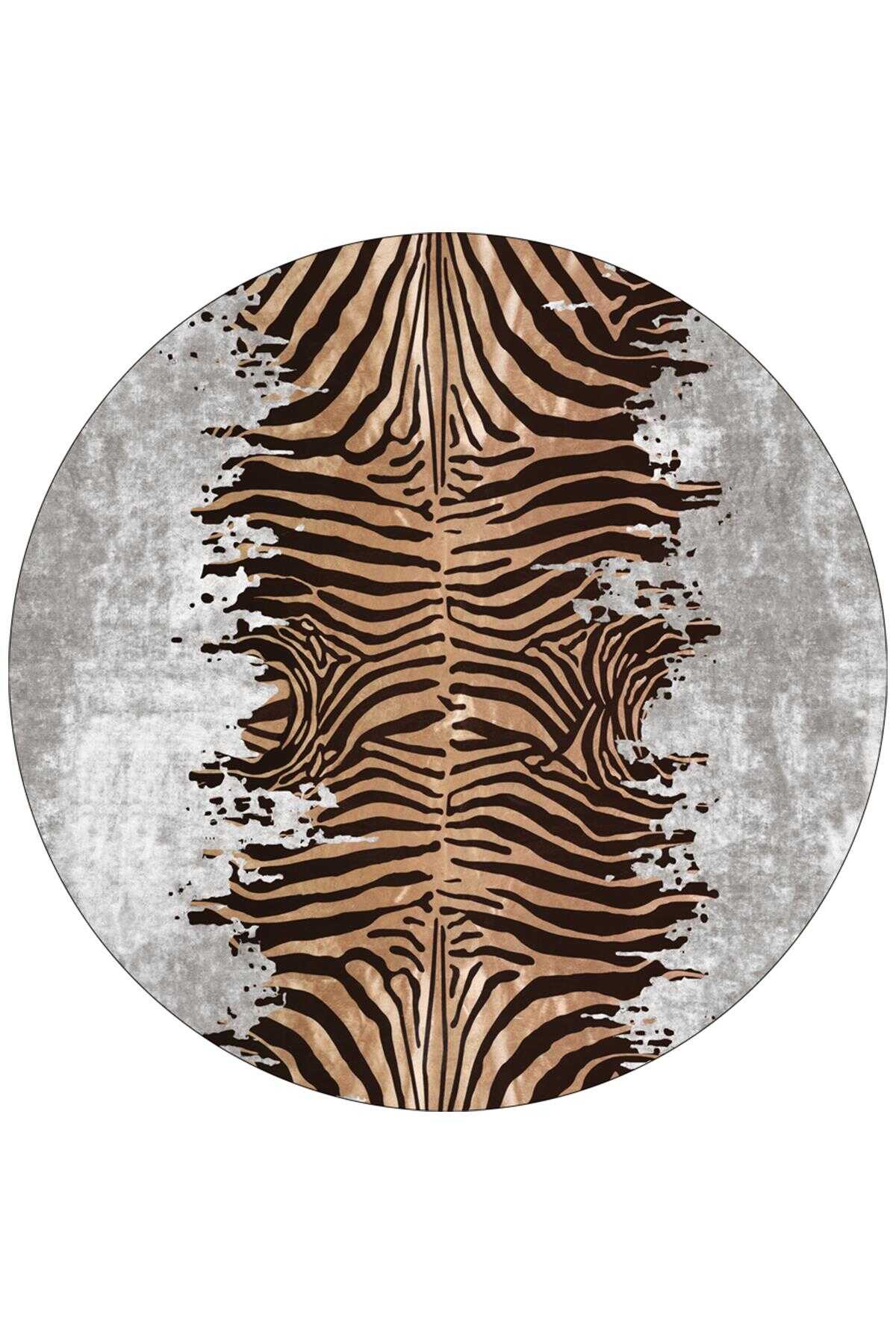 Frenda Home Zebra Desen Pamuk Taban Baskılı Yuvarlak Halı Gri
