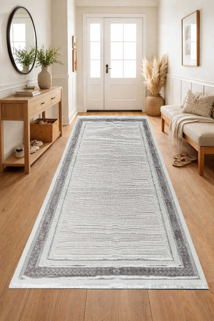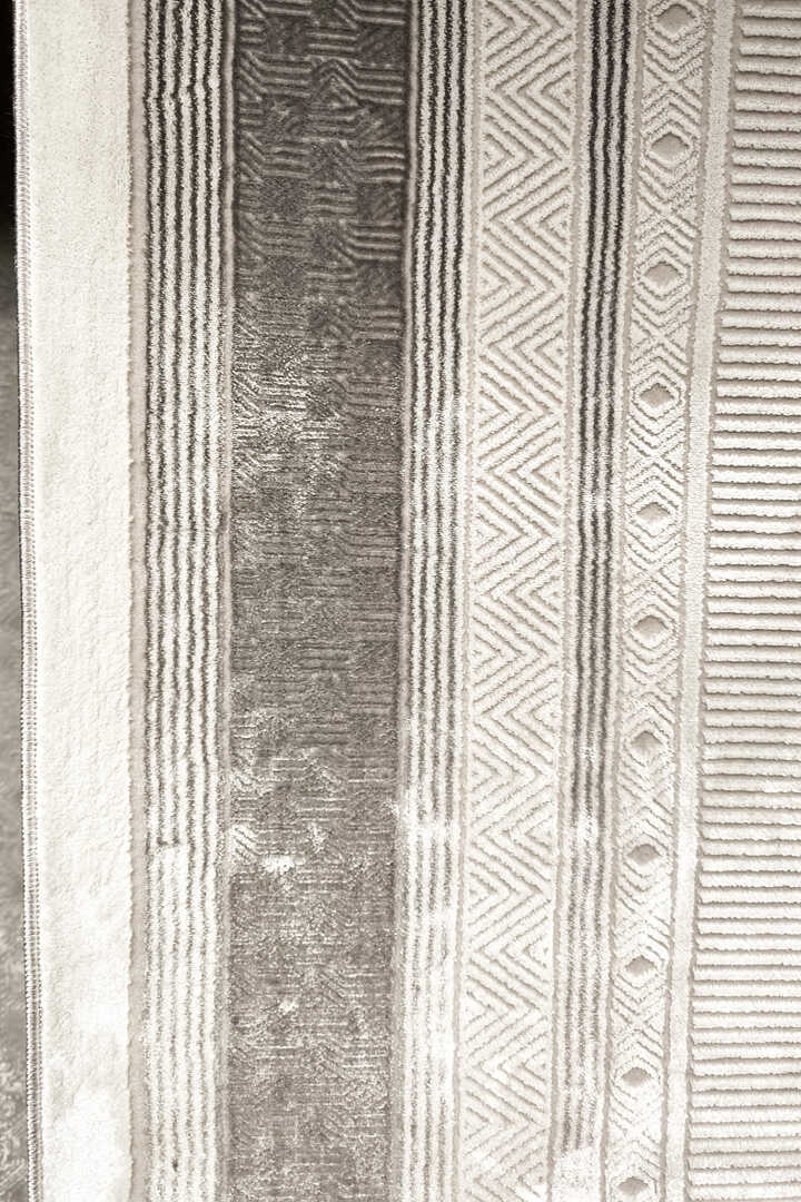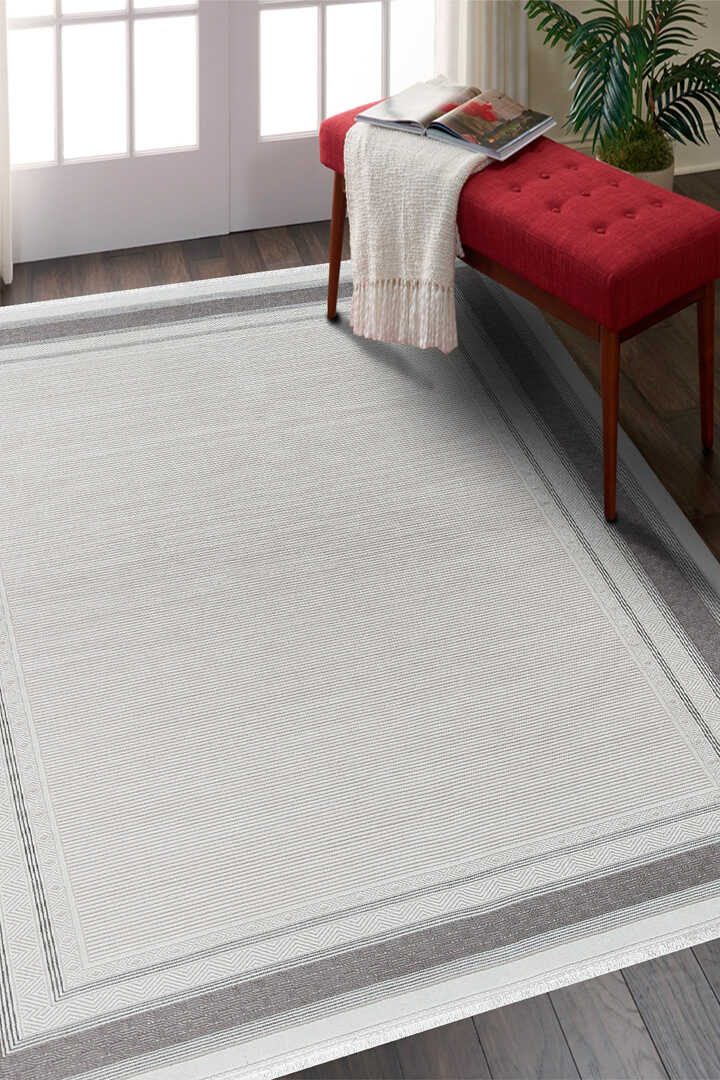 Parlak Saten Dokulu Poem Bambu Tuşe Klasik Çerçeve Desenli Halı Pm19 Beyaz