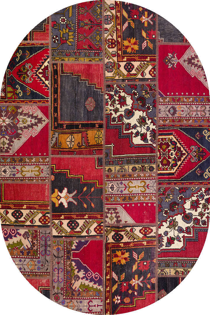 Patchwork Desenli Yıkanabilir Pamuk Taban Dijital Baskılı Oval Halı Kırmızı