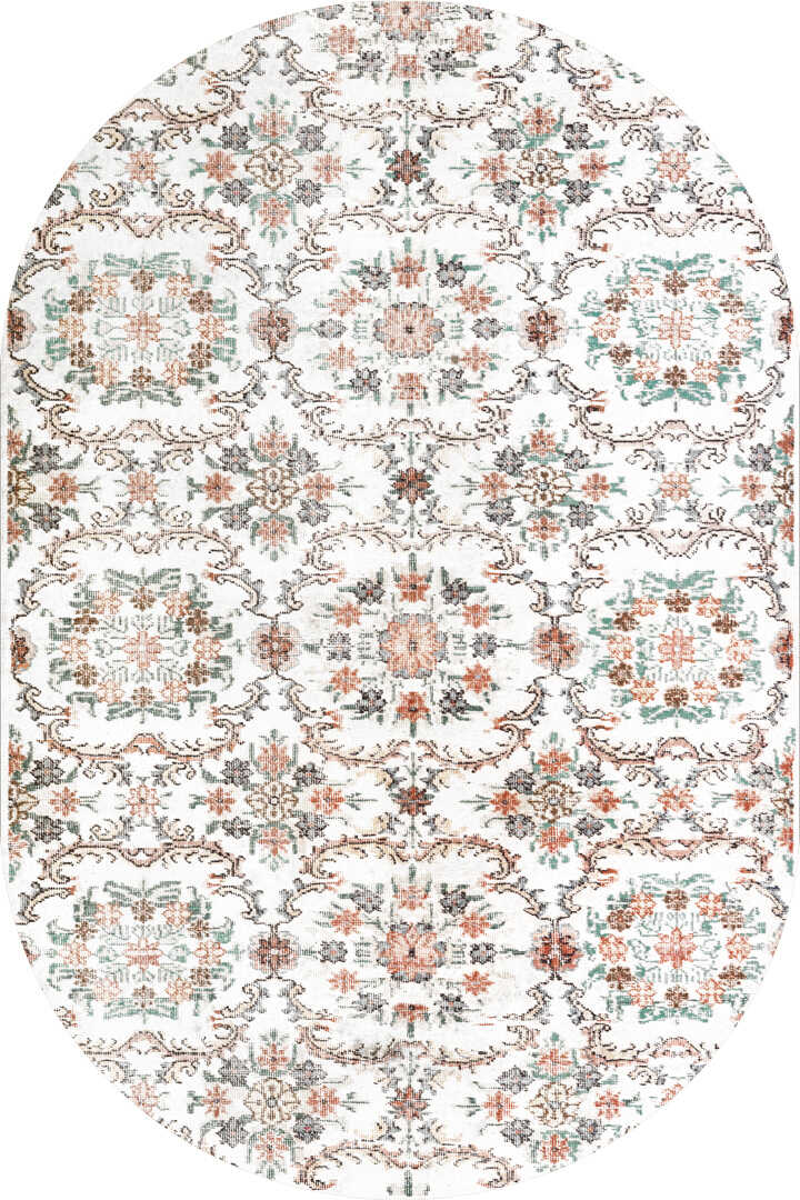 Vintage Desen Pamuk Taban Yıkanabilir Oval Halı Beyaz
