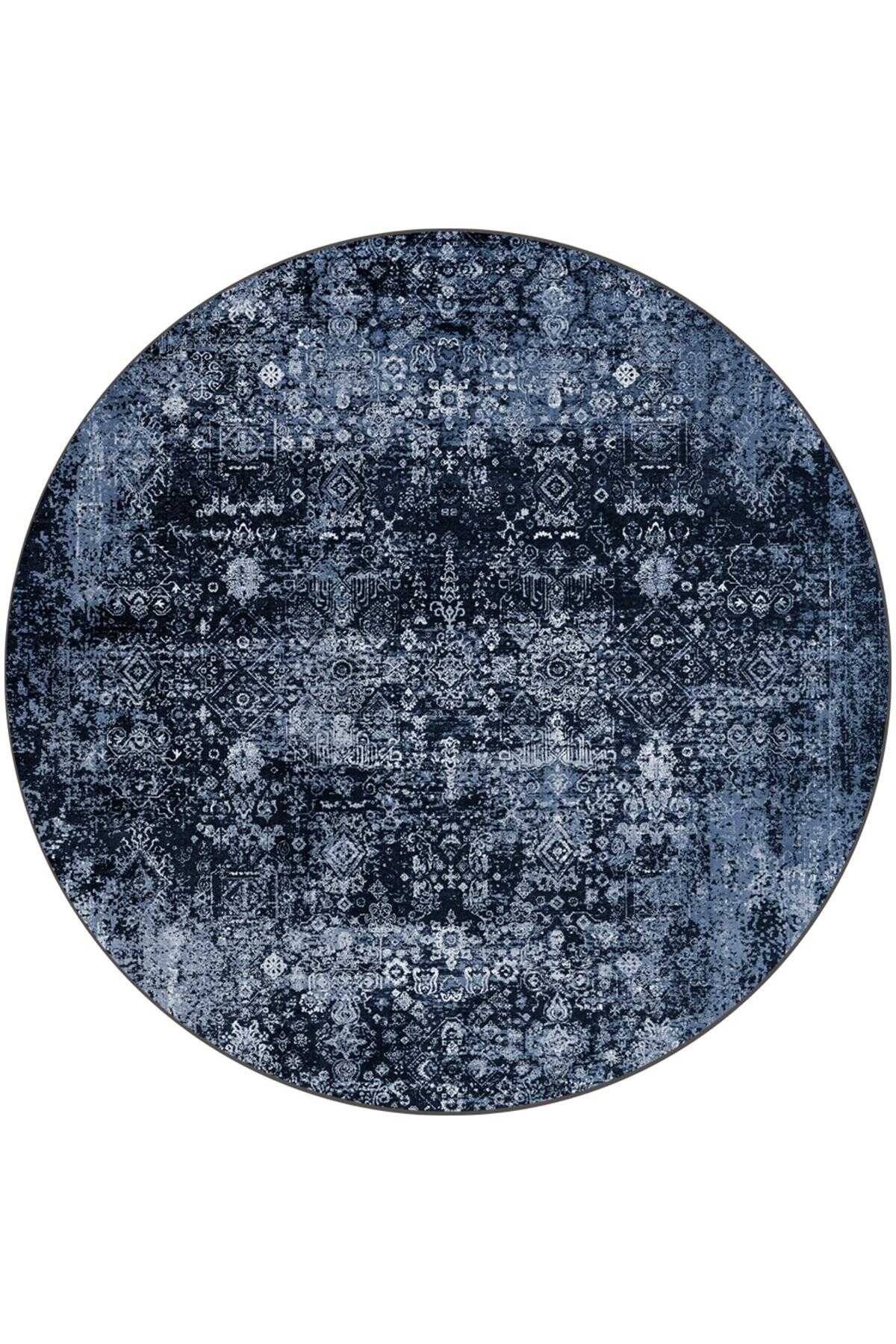 Vintage Desen Yıkanabilir Pamuk Taban Dekoratif Yuvarlak Halı Lacivert