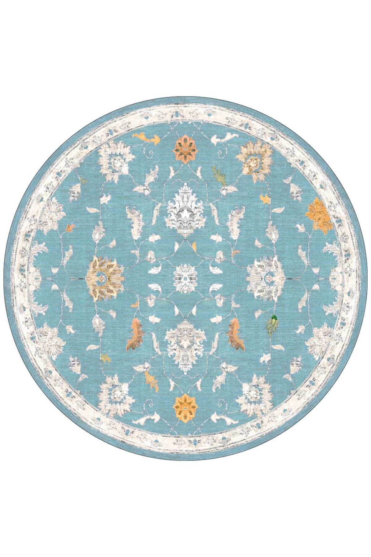Vintage Desenli Dokuma Pamuk Taban Dijital Dekoratif Yuvarlak Halı Mavi