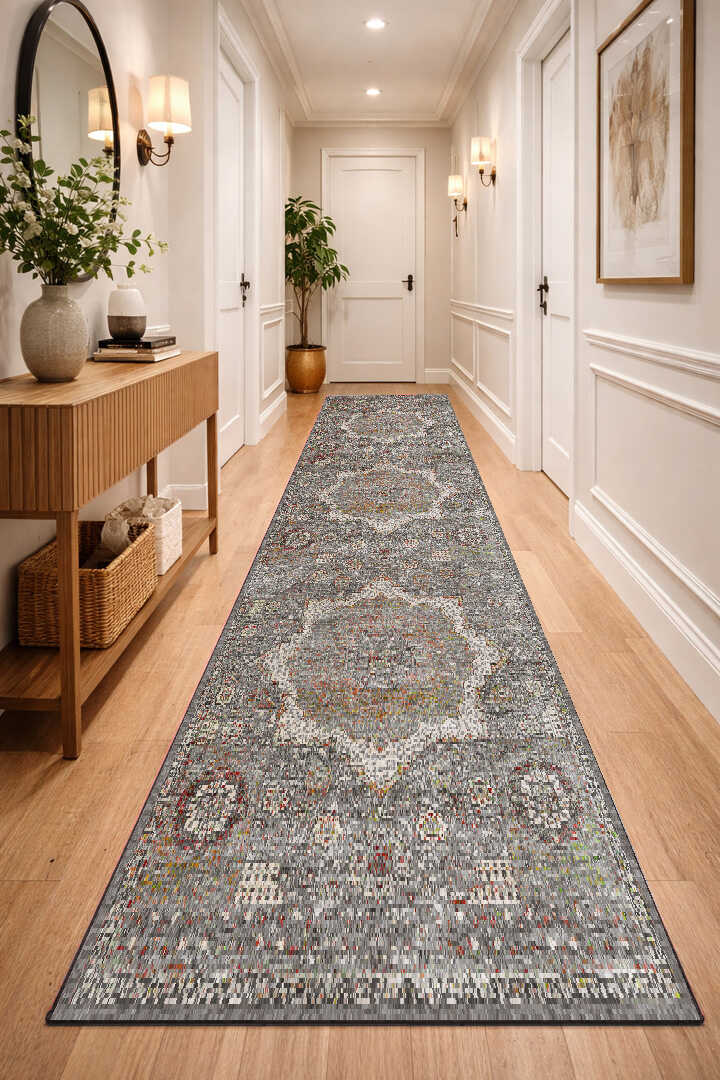 Vintage Desenli Pamuk Taban Dekoratif Yuvarlak Yolluk Halı Gri